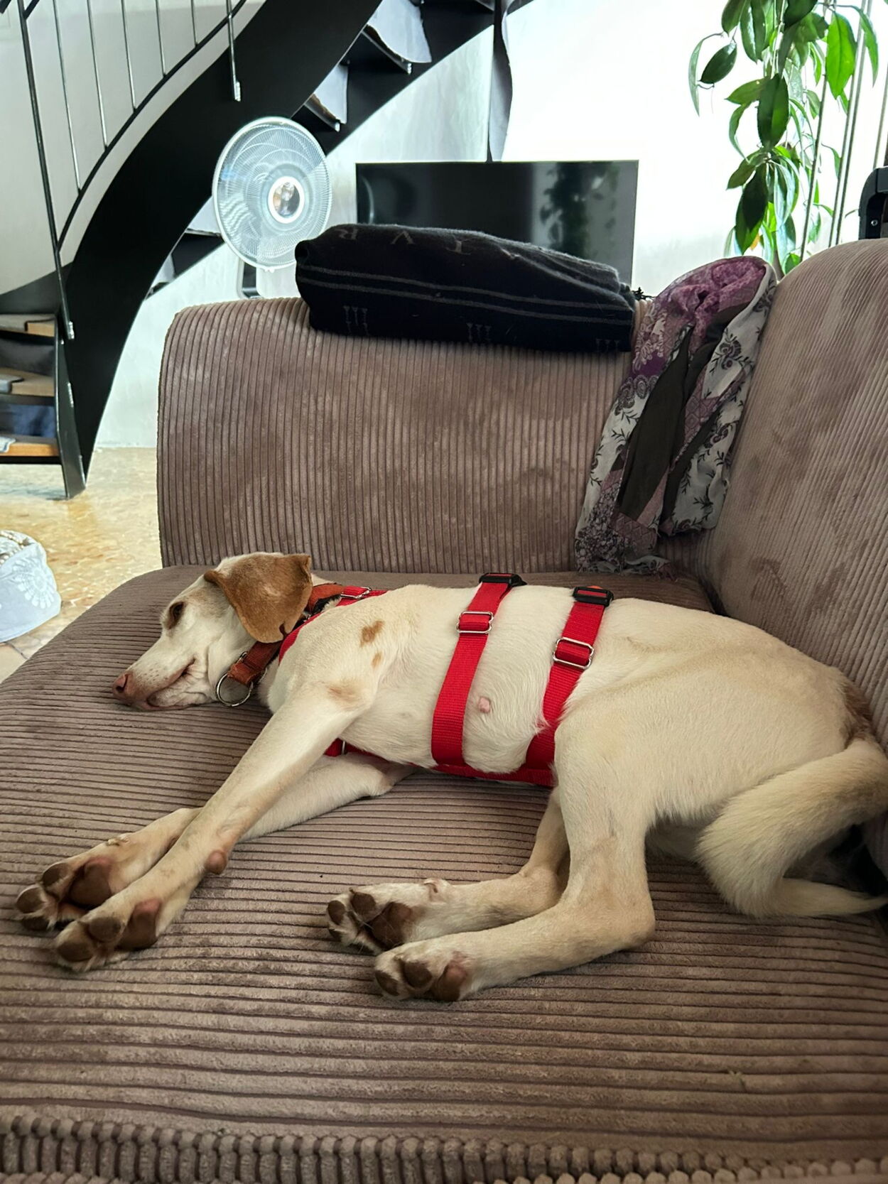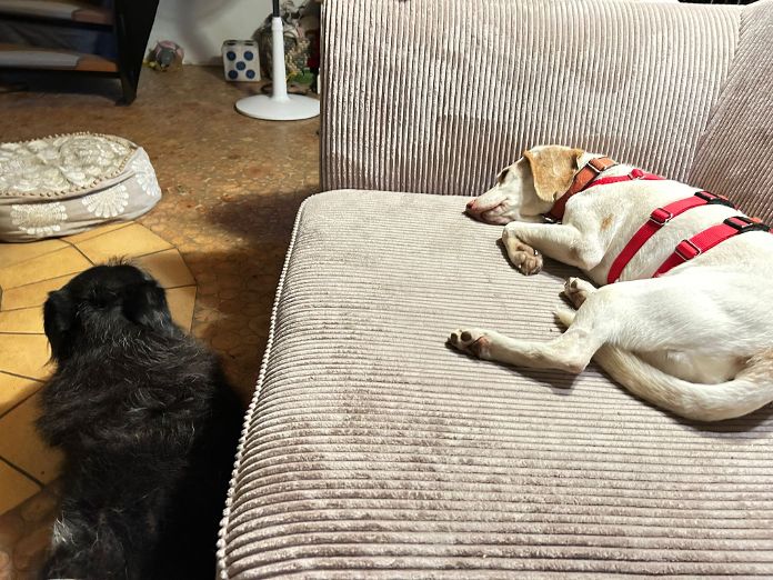 Im häuslichen Umfeld bewegt sich Haro sicher und fühlt sich sichtlich wohl. Die Anwesenheit meiner Hündin ist kein Problem; Haro kommt gut mit ihr zurecht, auch wenn er den Kontakt zu ihr nicht aktiv sucht. Für ihn steht die Interaktion mit Menschen klar im Vordergrund.
